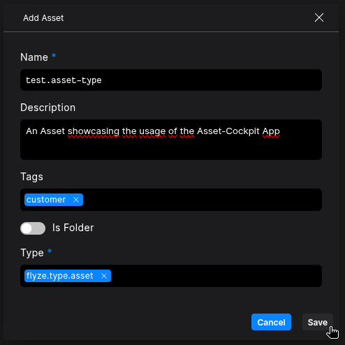 Configure your Asset, and select flyze.type.asset as Type