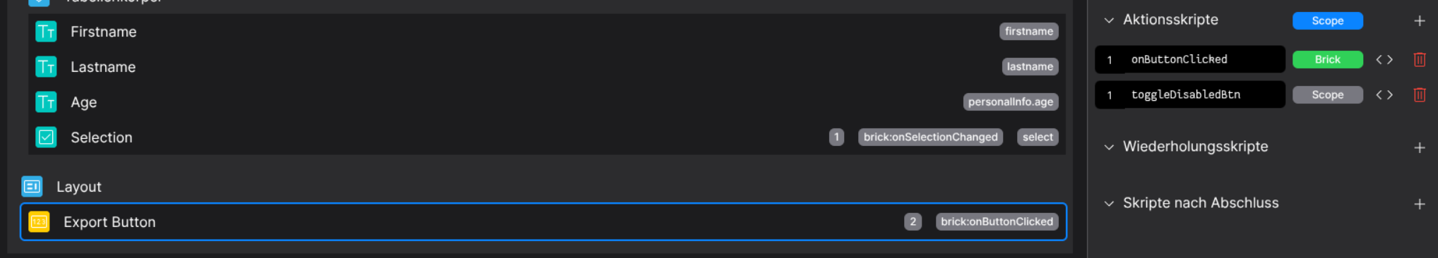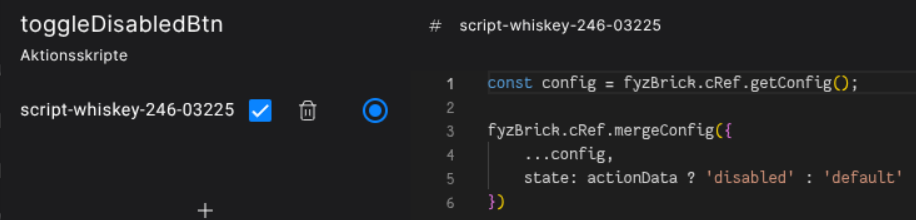 The fyzScope.event emits the event toggleDisabledBtn, which can be listened to on the Export Button: