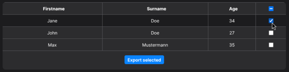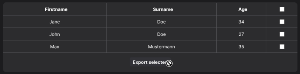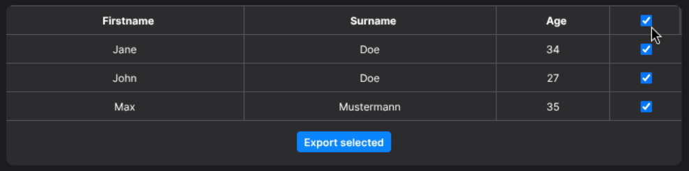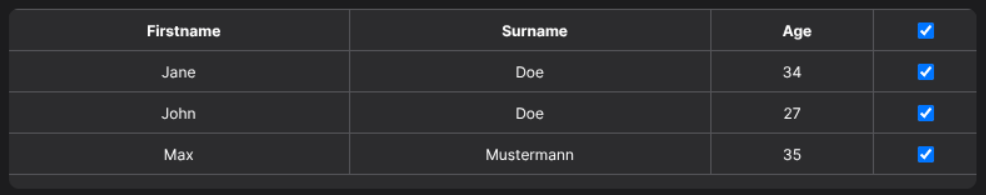 With the Selection-Column Brick, you are able to display a selection in form of a checkbox in your tables.