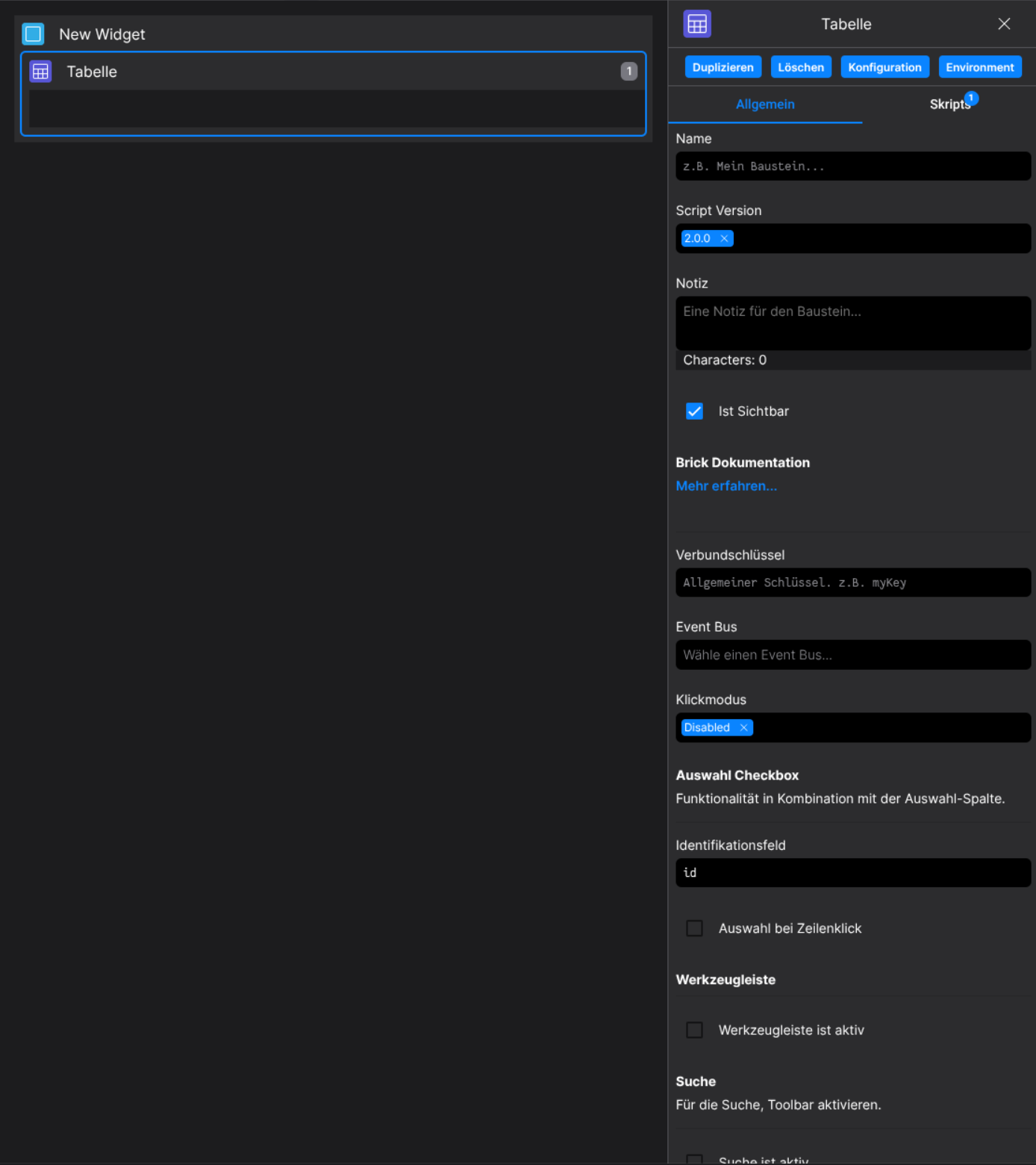With the Table Brick, you are able to implement a fully fledged Table into your Dashboards. The Table supports several features. Check the Configuration Properties for more information.
